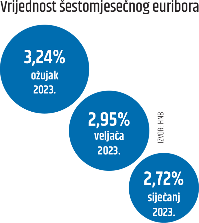 Tromjesečni je euribor sredinom ožujka bio nešto više od 2,8 posto (s -0,5% u ovo doba lani), šestomjesečni je iznad 3,1 (u lanjskom ožujku -0,4%), a 12-mjesečni preko 3 ,6 posto (prije godinu dana -0,2%).