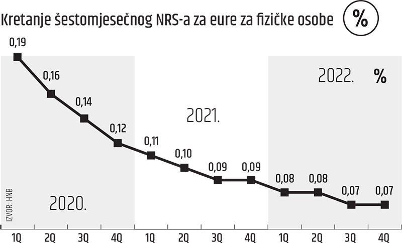 HNB je pak početkom ožujka objavio nove vrijednosti nacionalnih referentnih stopa (NRS). Posljednje ažuriranje odnosi se na zadnji kvartal 2022., a najnoviji izračuni prosječne cijene izvora financiranja postojećih banaka pokazuju da su unatoč smjeru monetarne politike u europodručju vrijednosti NRS-a u četvrtom tromjesečju uglavnom stagnirale ili su se nastavile smanjivati. Primjerice, vrijednost najzastupljenijeg indeksa u ugovorima o potrošačkim kreditima (šestomjesečni NRS1 za euro) za četvrti kvartal 2022. ostala nepromijenjena, na 0,07 posto.